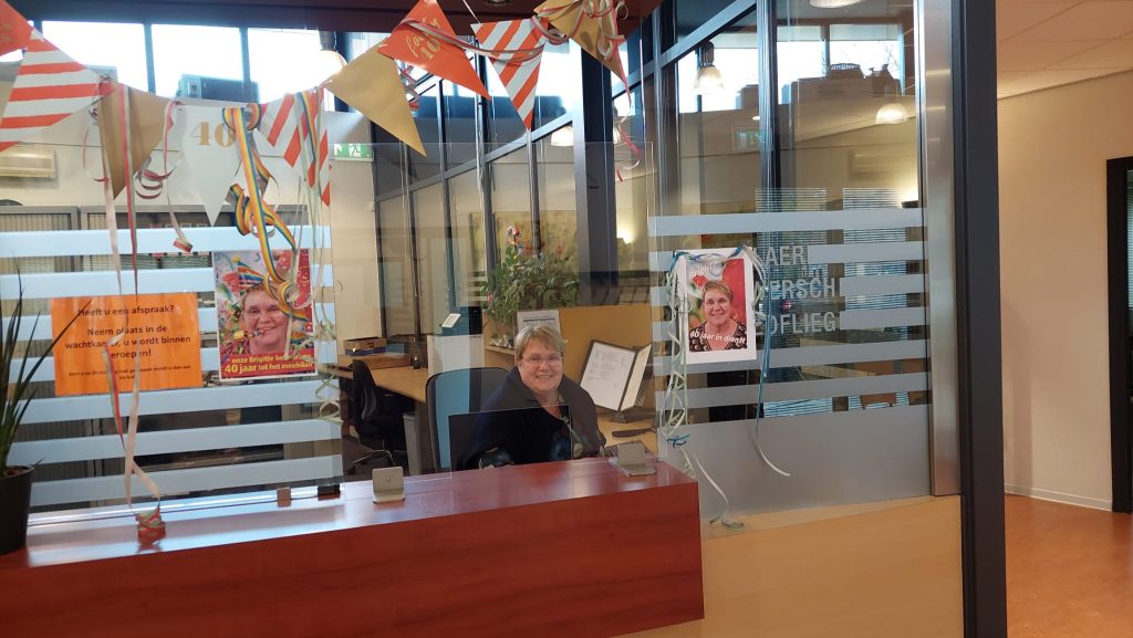 Onze praktijkassistente Brigitte is 40 jaar bij ons werkzaam. Een enorme mijlpaal en uitzonderlijk. We zijn er trots op Brigitte in ons team te hebben. Ze is al die jaren voor veel van onze patiƫnten een belangrijke steun en toeverlaat geweest.