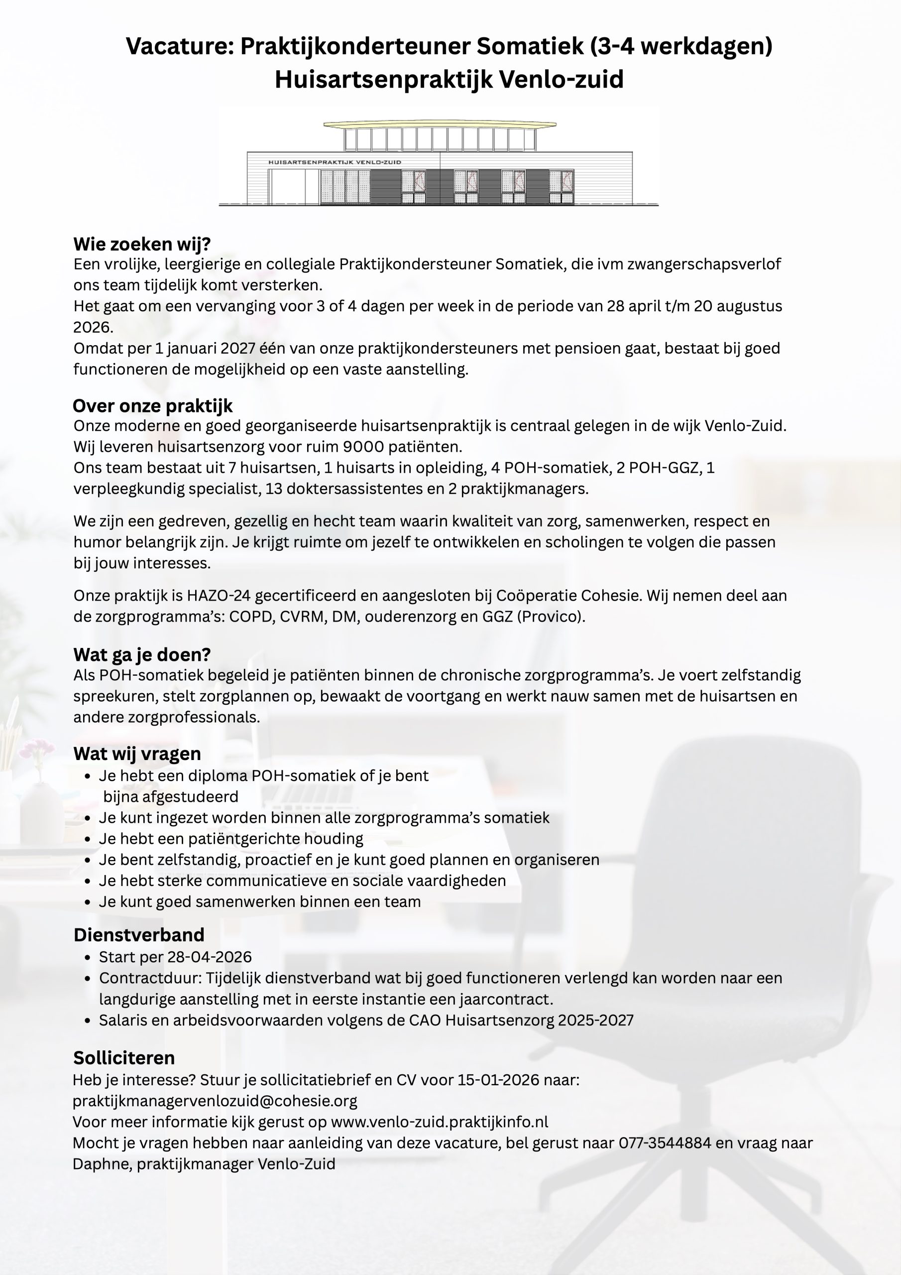 Vacature praktijkondersteuner Somatiek 10 december 2025Wij zijn op zoek naar een praktijkondersteuner somatiek. Klik hier voor de vacaturetekst.